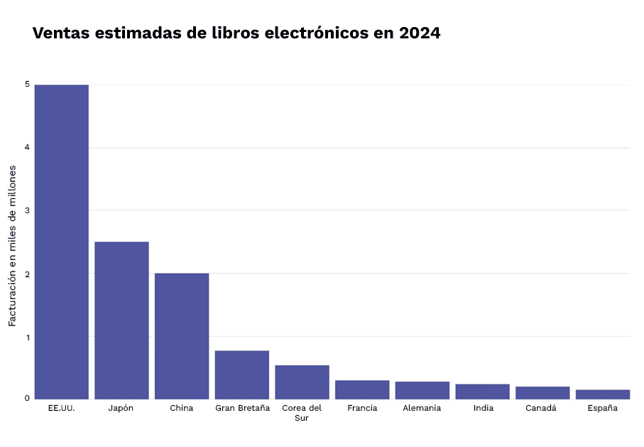 El gráfico muestra los diez países que lideran el mercado mundial de libros electrónicos. Resulta especialmente evidente la fuerte influencia del mundo anglosajón en el mercado mundial de libros electrónicos: solo Estados Unidos alcanzó en 2024 unas ventas de alrededor de 5300 millones de dólares estadounidenses. Le siguen de cerca importantes mercados asiáticos. Europa queda algo rezagada en comparación, pero sigue siendo un actor relevante gracias a su diversidad y a su público estable. Los datos ponen de manifiesto que la lectura digital está firmemente establecida en todo el mundo, con dinámicas regionales diferentes.
