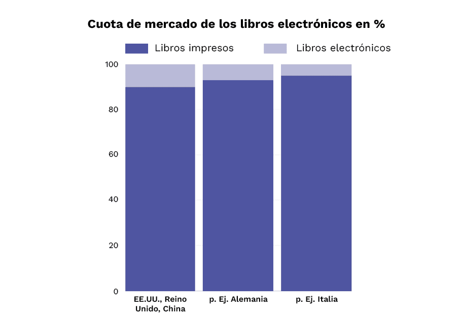 Aunque los libros impresos siguen dominando el mercado global, la cuota de lectores de libros electrónicos crece continuamente en todo el mundo. Estados Unidos, Reino Unido y China lideran este mercado con alrededor del 10 %. Alemania se sitúa en una sólida posición intermedia.