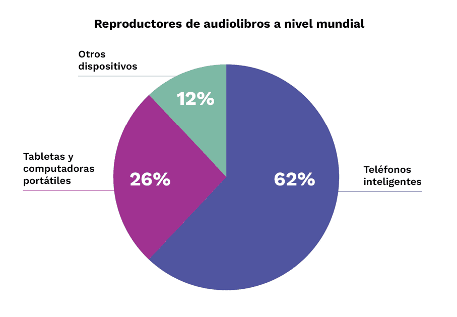 Los teléfonos inteligentes son el dispositivo más importante para escuchar audiolibros en todo el mundo. Las tabletas y los ordenadores portátiles les siguen de cerca. Otros dispositivos, como los altavoces inteligentes, los wearables y los sistemas para automóviles, desempeñan actualmente un papel menos importante.