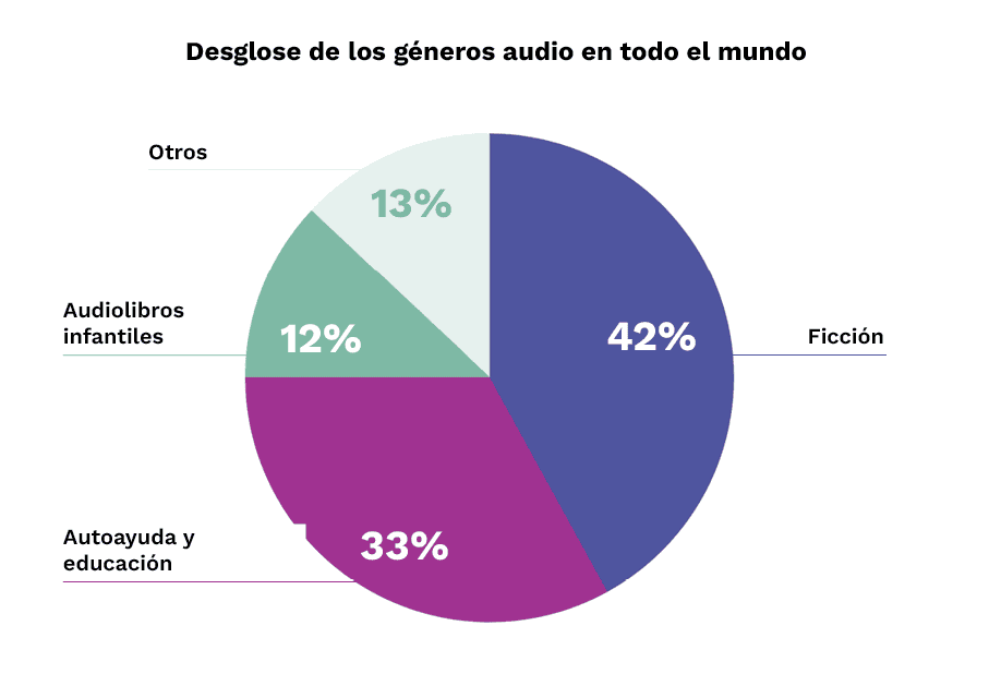 Entre los géneros de audio más populares a nivel mundial, la «ficción» ocupa claramente el primer lugar y atrae a la mayor audiencia. Le siguen los audiolibros de autoayuda, educativos e infantiles. La distribución por géneros muestra que, aunque los hábitos de escucha pueden variar de un país a otro, ciertos contenidos funcionan especialmente bien más allá de las fronteras nacionales y lingüísticas.