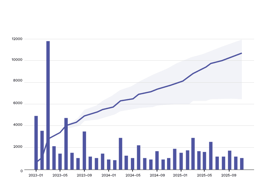 Los dos gráficos siguientes muestran la evolución mensual (gris) y acumulada (azul) de las ventas de dos títulos, en los que las ventas acumuladas del primer título se sitúan en la parte superior del rango de ventas esperado (amarillo), mientras que el segundo título se mantiene en la parte inferior de las expectativas.