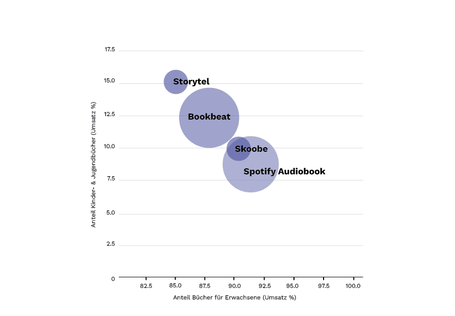 Incluso en el caso de las campañas que van más allá de las estrategias de precios, los datos específicos del mercado y de la plataforma son fundamentales para el éxito. Veamos otro ejemplo: una editorial quiere promocionar una nueva serie de libros juveniles (audiolibros) mediante anuncios en Facebook. Los anuncios contienen un enlace al primer título de la serie en una plataforma de streaming. Esto plantea la pregunta: ¿a qué plataforma debe dirigir el enlace? Dado que no todas las plataformas proporcionan datos demográficos, la «afinidad con los libros juveniles» solo puede estimarse, basándose en las cuotas de ventas o de streaming que tienen los títulos del género «libros infantiles y juveniles». Esto da como resultado, por ejemplo, para determinados proveedores de streaming en el mercado de habla alemana:
