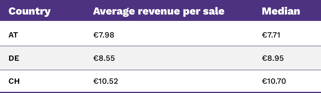 Austria se sitúa así claramente por debajo del nivel alemán (aprox. -6,7 %). La mediana, es decir, el valor que divide todos los precios de venta obtenidos en dos cantidades iguales, se sitúa incluso 1,24 € por debajo de la mediana en Alemania (-13,9 %). Esto significa que el 50 % de las ventas en Austria son inferiores a 7,71 €. Sin embargo, lo normal sería que Austria estuviera al mismo nivel o ligeramente por encima de Alemania, ya que ambos países tienen un poder adquisitivo similar (con ligeras ventajas para Austria).